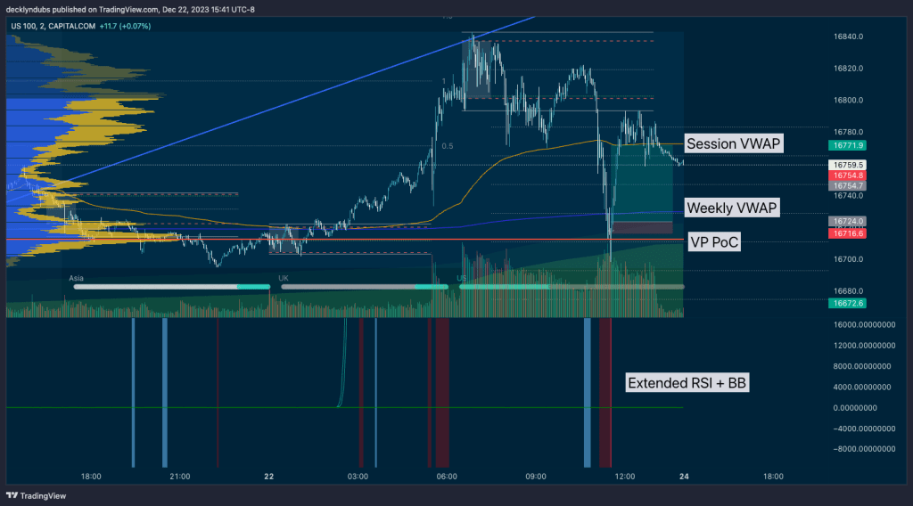 Here is a scenario from today Friday Dec 22 trading Nasdaq (US100 CFDs) where the multi-time frame RSI analysis indicates an oversold condition on 1m, 2m, 5m charts close to the end of the trading day. The price is significantly below the session VWAP, and falls to the session volume profile’s Point of Control from Asia (eg the price that it has traded the most volume at.) . It also breaks through and the weekly VWAP and then returns over it. This confluence of indicators presents a compelling case for a bullish retratement towards the session VWAP.