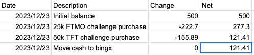 Leaving 121.41 of the $500 initial investment. This brings our total to -378.59. We get a refund when we pass the challenges.