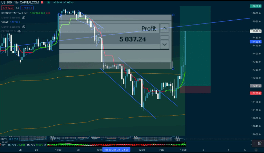Today was an A++ setup. I was a little late, but got entry on pullback and it looked mega bullish. I’m long on BTC as well but it hasn’t moved yet (~42500 and I added more on a pullback from 43000, again a little late but it’s holding AVWAP.) Maybe I was lucky, I was just reading the data, but big tech earnings after hours caused an EXPLOSION with Nasdaq closing apx +2.2% on the day.