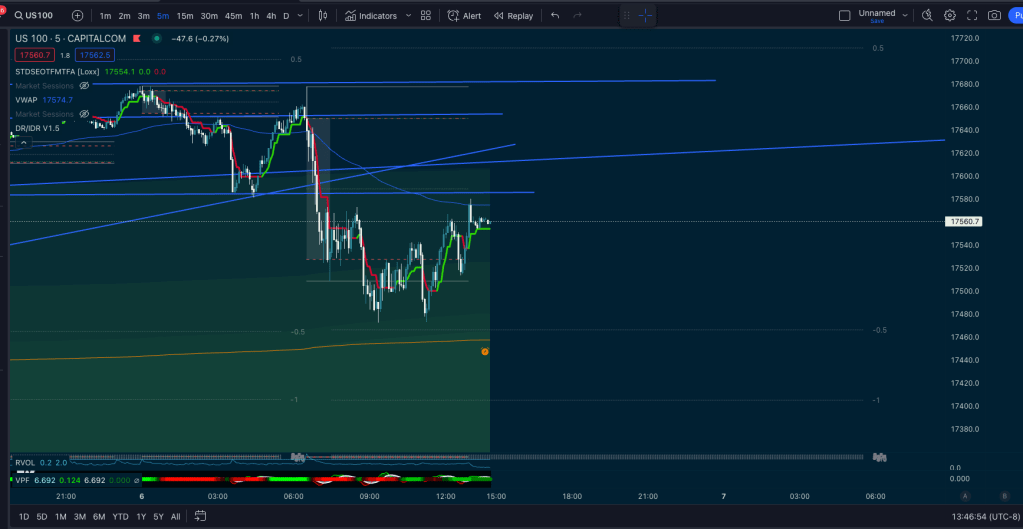 Market internals were really crazy this AM. S&P looked strong on open, NASDAQ was all over the place. Got stopped flat on S&P – VOLD was really high on open, and the market quickly shifted. I opened a large short on Nasdaq a little late and let it run. Took profit aggressively as it notched down, and looked for the signal to enter/continue.