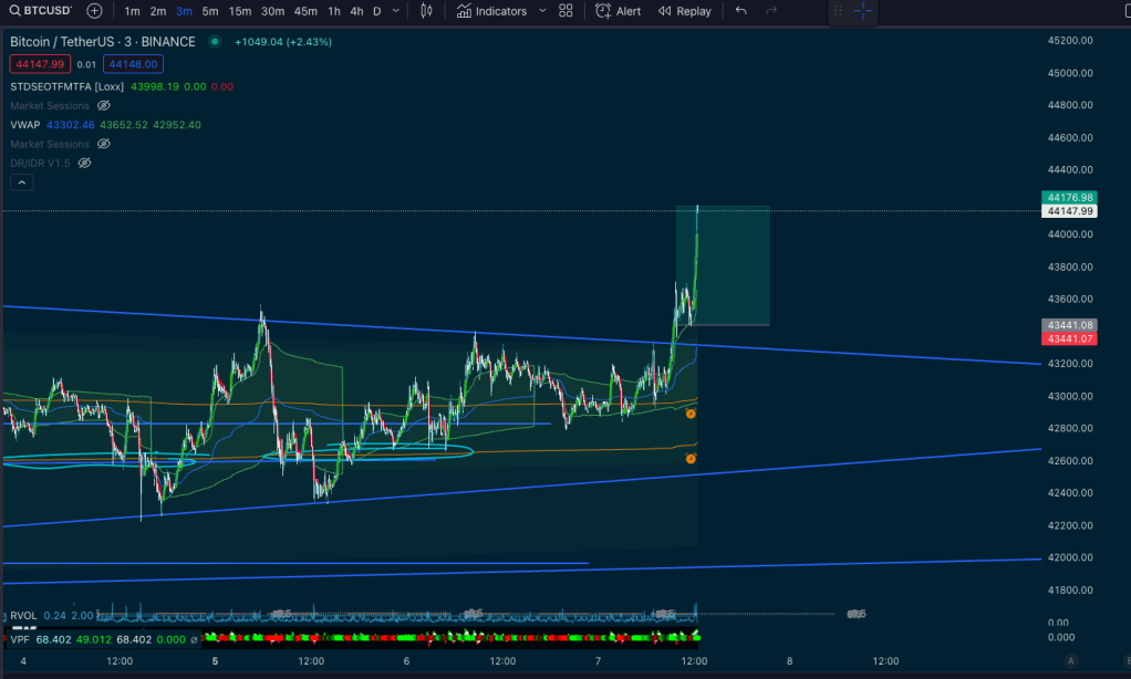 I was trying to trade BTC off of the high timeframe AVWAP around the pivot but noticed I kept getting shaken out and gave back some profit from other big moves. Late in a period of consolidation, it gets more obvious that there is a move coming, so instead of gambling or stressing over holding a position, I just set some risk (~$60) on a buy stop limit order at an area that was a clear breakout. It could have failed but the RR was good. I still closed it as an intraday trade in the last hour of NYSE, maybe would have been better to hold this one, but I’m a day trader and I don’t like to gamble or keep risk open. Was only a half BTC, but was a nice clean 0 stress trade.
