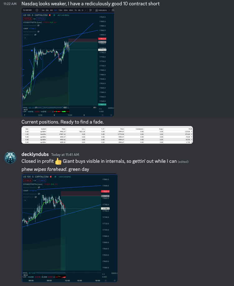 Sitting green, I took some risk on again shorting into the US30Y bond auction (25bn) which is a MASSIVE load of debt, and after the competitive portion closed, the 30Y yield dumped causing equity to reprice up against me. I had to be a bit patient holding Nasdaq and S&P shorts as the repricing knocked my position out of green. Once I found a profitable exit, I closed and didn’t look back.