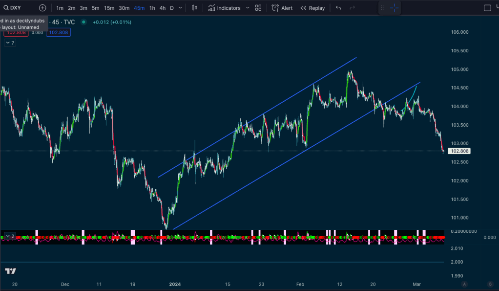 It took me a while to dig back over the testimony or Jpow and understand that the willingness to flex on the Basel III Endgame proposal, after receiving extreme opposition, is a signal for weaker banking restrictions and, I hypothesize, a rising M1 and near-term safety in the markets. I entered a long after digesting this a bit, as I was short biased.