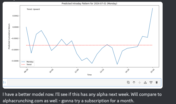 Throughout this week, I’ll be closely monitoring the performance of this refined strategy. I’m particularly interested in seeing how the intraday seasonality predictions align with actual market movements and how this data-driven approach impacts my overall trading performance.