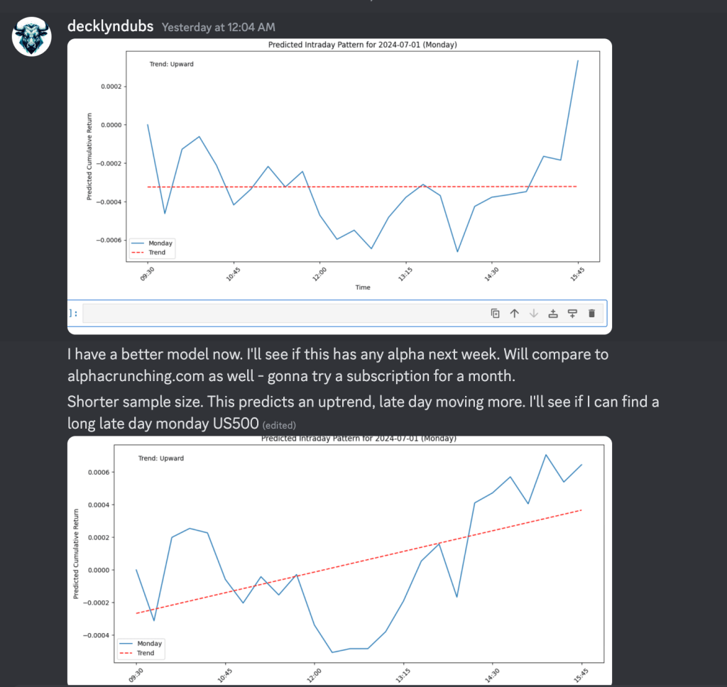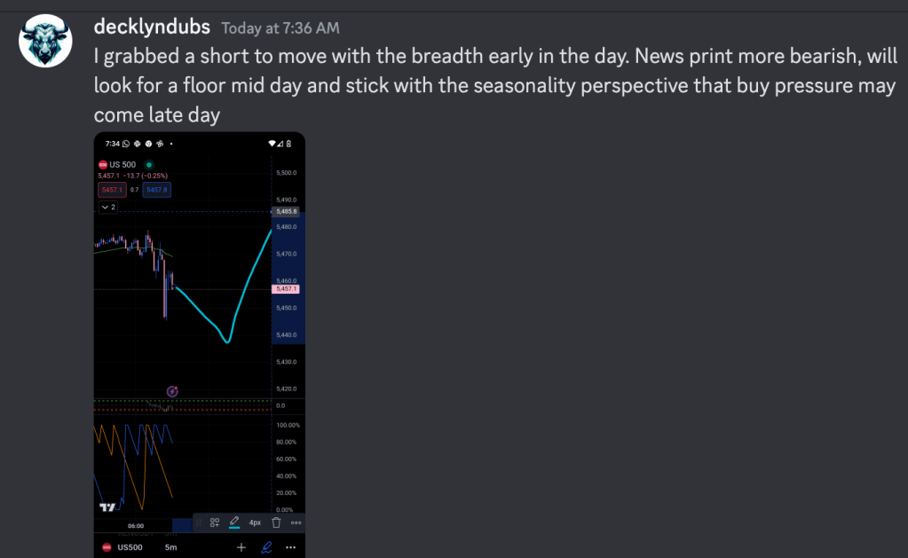 Day 1 trying to add intraday seasonality as a signal. I traded S&P. I took two trades and closed them both green. I got about 70% of the daily range I’m guessing. PMI came in during the market session and I read it as bearish for rate cut probability due to some inflationary pressures.