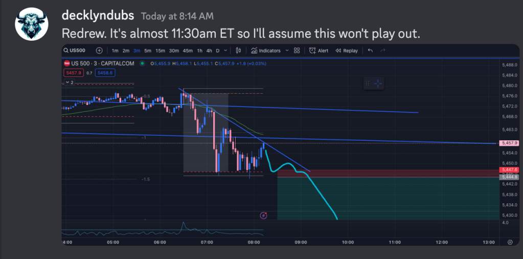 I exited, and I saw a setup for a further breakdown, but it didn’ meet my criteria for entry so I skipped this trade as we hit 8:30am PT/11:30am ET which is my “reset button” if the day isn’t a trend day.