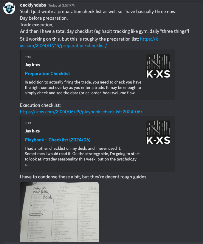 In addition to actually firing the trade, you need to check you have the right context overlay as you enter a trade. It may be enough to simply check and see the data (price, order-book/volume flows, time of data) but you will want to also have a map for the day. This document attempts to outline a checklist for preparation to choose and trade a market.