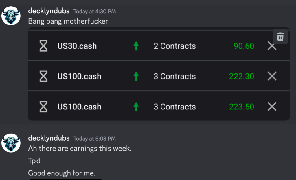 The trade was outside of market session, before Asia open on a Sunday night. This was 100% a macro trade, I didn’t check the chart at all apart from watching that the market gapped up significantly on futures open. I jotted down an explaination in Discord for the reasoning behind the entry, and the exit.