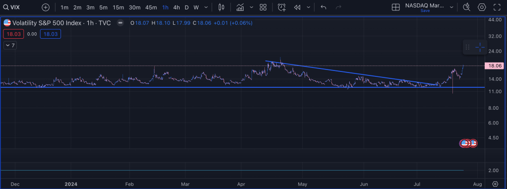 One of the things that I noticed in the July market sell-off was that the VIX seems to show where the volatility will come in. The VIX crept along at a yearly low in a consolidation pattern (descending wedge) and broke out from a multi-month consolidation pattern:
