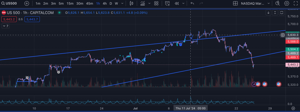The contraction in the S&P/Nasdaq is precipitated when the VIX cleanly starts the breakout. July 11th the VIX starts to waver, and within a few days a trend shift starts to appear in the markets.