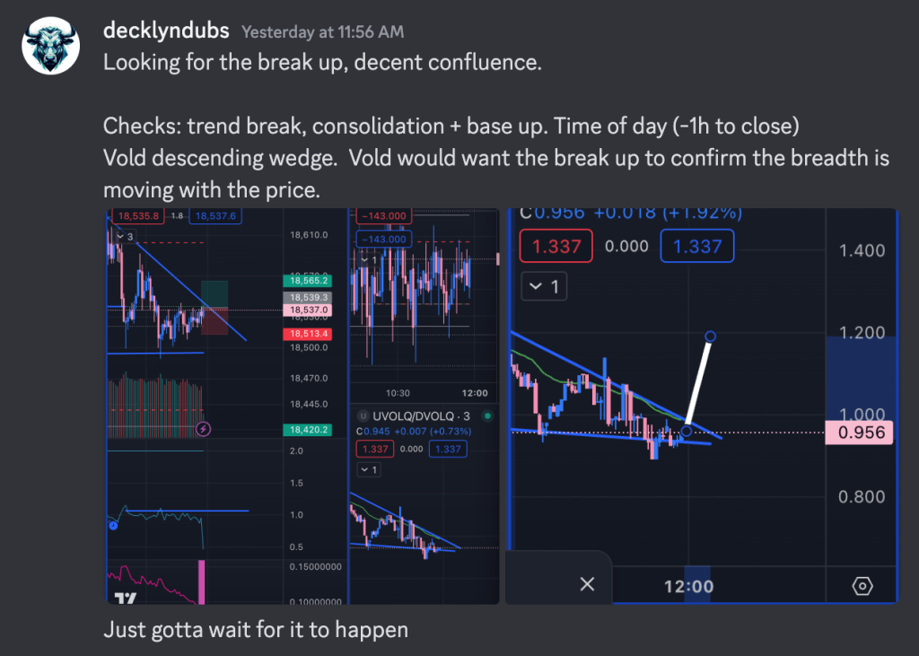 I found a long entry towards the NYSE session close and took it to hold. You can see some patterns: VOLDQ is in a descending wedge, and even though that data is very much derived, it still shows the same patterns and probabilities. I’m often looking at market breadth _before_ price to ensure the wind is at my back. When the price and breadth patterns break together, it makes for a confident entry. This trade was right into close, so you start to lose visibility to breadth. I was confident in my assessment: funds are using any liquidity that they can into CPI or Unemployment. I don’t know what the news is, but I can see that it’s coming.