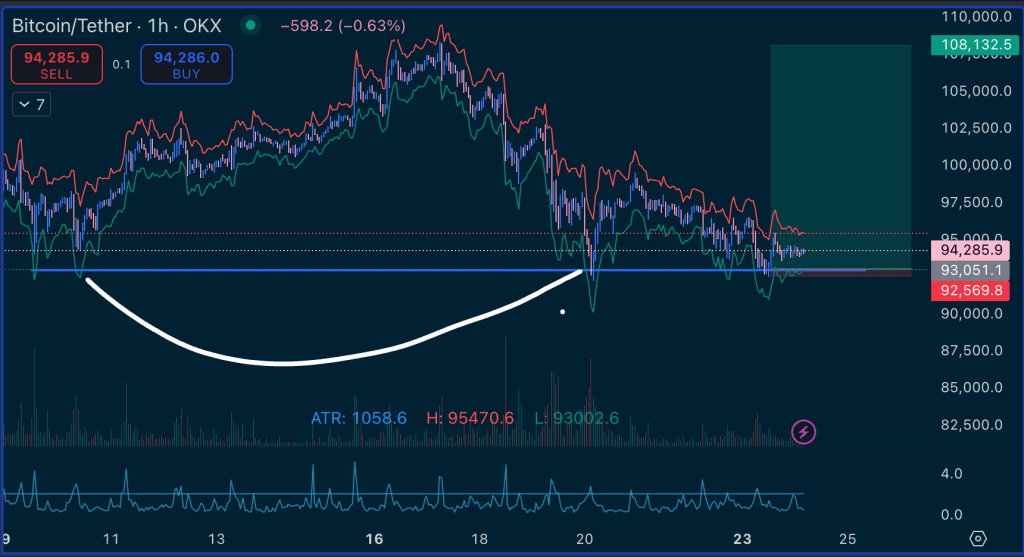 You can see the level under 93000 on the ATR stops indicator highlights an area that could run, and the liquidity from that area is likely to run the market the other direction. The liquidation heatmap shows our target areas.