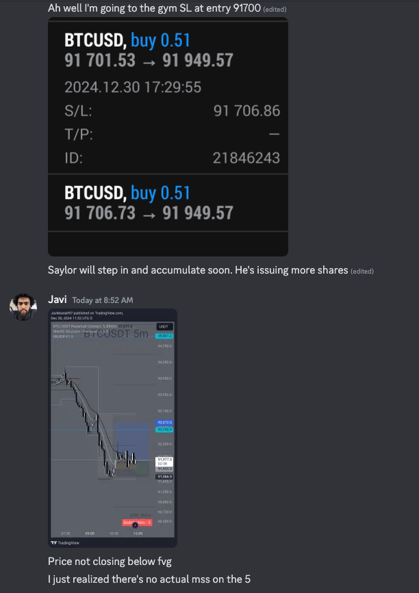 This bitcoin trade we spotted the liquidity run under 92600 which was where I was watching, I got on this hard when I saw it, went to the gym. I enter in two so that I can take a partial to cover a risk and the next trade once I get the move, and then the rest can run risk free. Do this same thing multiple times: catch a pop, take partial, leave some to run. You have to be really aggressively exiting positions to put huge weight on the entries, so I literally set the stoploss at entry ASAP and then just go do something else. I went to the gym.